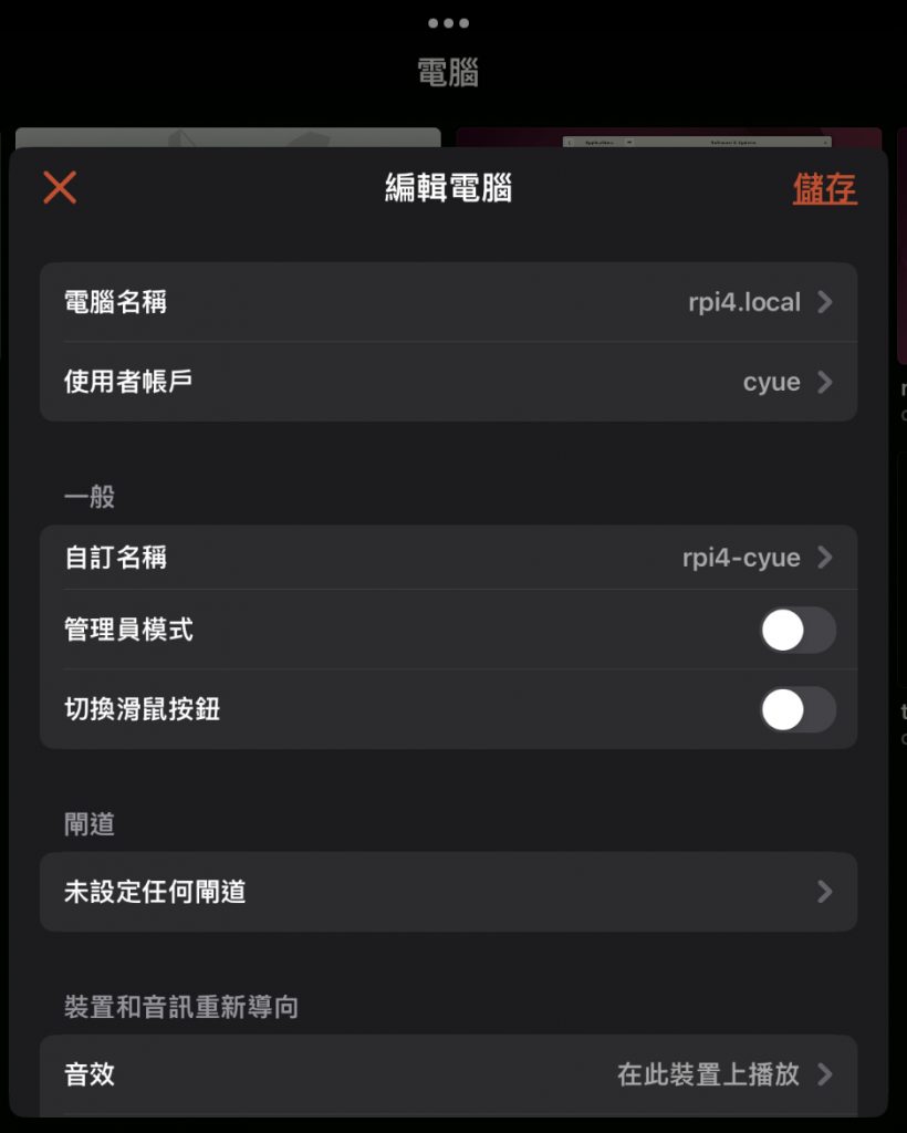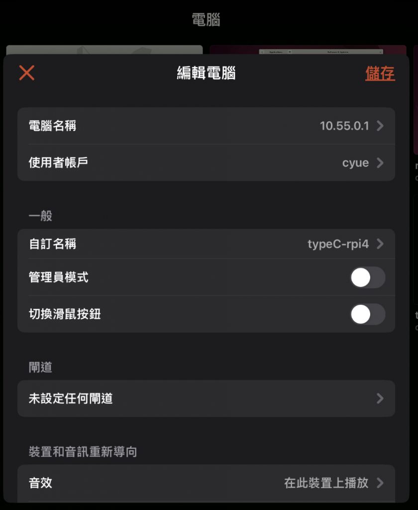 iPad若使用typeC线给树莓派4供电,可以选择透过设定的 IP:10.55.0.1 有线连接树莓派。当 iPad与树莓派4在同一个Wifi网域,可以使用 rpi4.local 连接树莓派。所以,我会在 RD Client 中定义两台PC,就可以在在不同的状况下连接树莓派的桌面。