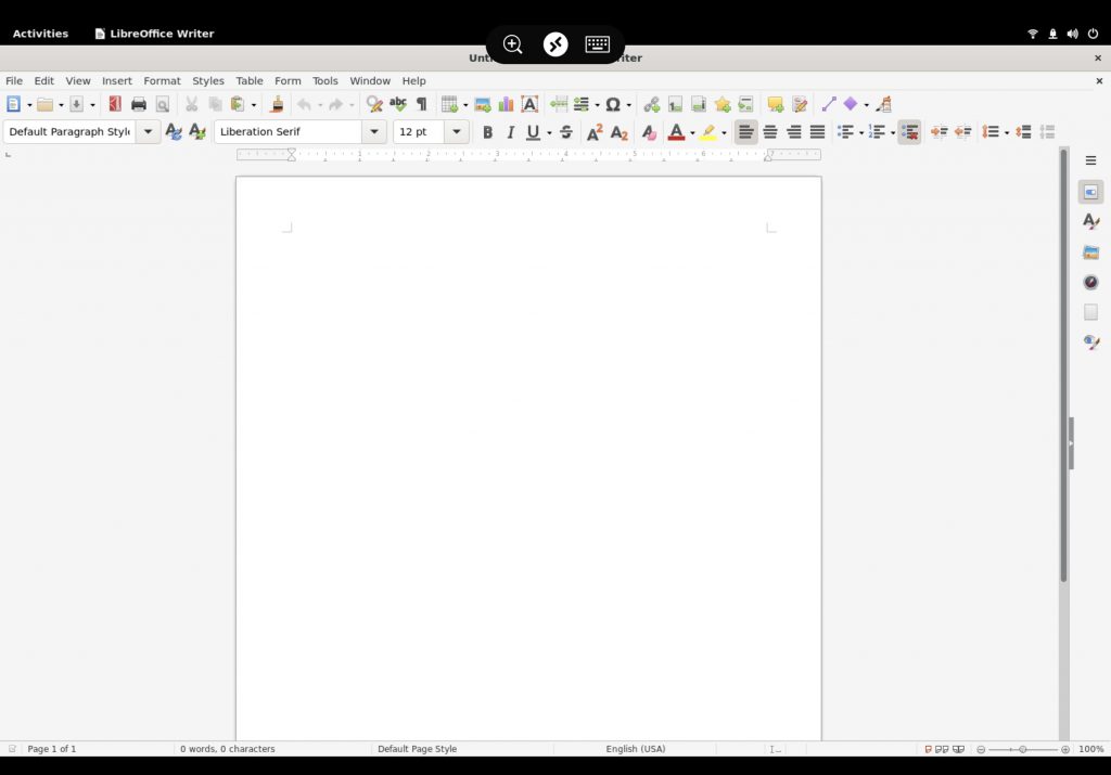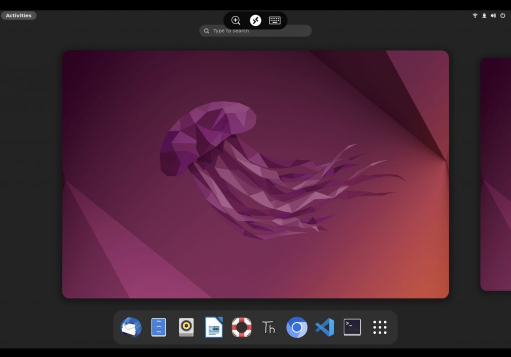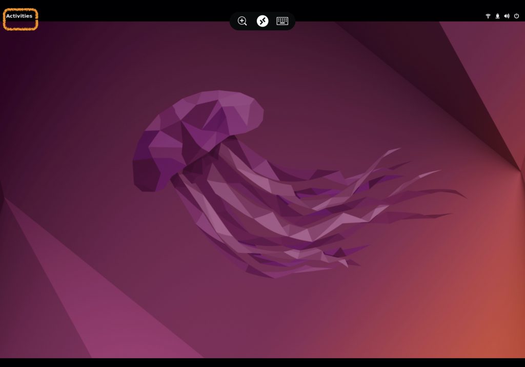 输入账户后,会进入桌面,之前没执行程式的话,桌面干干净净。右上角是电源网路VPN等的设置按钮,左上角是开始行动(Activities)的按钮。中间上方的是RD Client 应用的控制按钮。