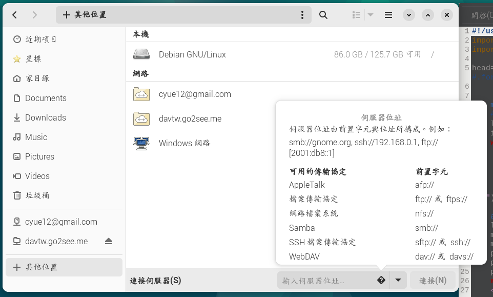 Linux GUI下的 WebDav網盤設置: 文件管理器 –> 其他位置 –> 連接伺服器 –> 輸入伺服器位址.